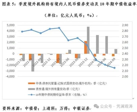 2023年三季度至2024年二季度,以人民币计值的全球人民币储备规模累计下降了3675亿元。然而,鉴于同期中债收益率震荡下行(10年期中债收益率由2021年底的2.78%降至2024年6月底的2.21%),境外储备经营机构减持的人民币资产应超过了前述规模。值得一提的是,2023年三季度至2024年二季度,各季境外持有人民币储备规模分别下降810亿、400亿、773亿和24亿元。这表明境外人民币储备经营机构未参与2023年9月至2024年6月外资持续增持境内人民币债券资产的行动。境内记账式人民币国债是境外人民币储备资产配置的主力品种。债券通的统计数据显示,2023年三季度至2024年二季度间,境外机构记账式国债托管量累计增加673亿元,仅贡献了同期外资净增持境内人民币债券10323亿元的6.5%(见图表5)。
