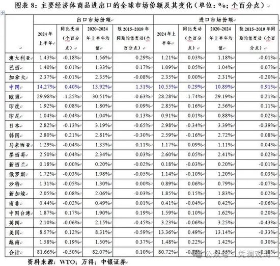 根据WTO的最新数据,2024年二季度,中国商品出口的全球市场份额为15.26%,环比、同比分别上升了1.61和0.89个百分点;2024年上半年,中国出口市场份额累计为14.27%,同比上升了0.40个百分点(见图表7)。
