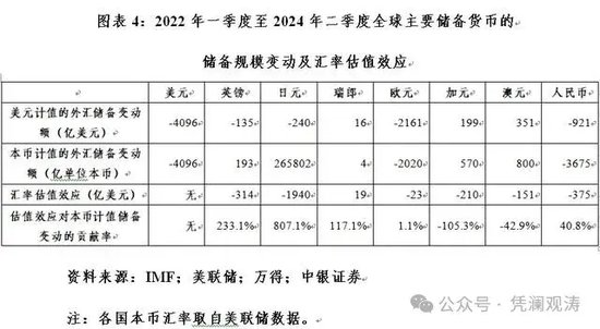 根据美国财政部国际资本流动报告(TIC)数据,2022年初至2024年6月,外资官方持有美债余额累计减少2907亿美元。其中,交易引起的减少额为198亿美元,贡献了6.8%;美债收益率上行(同期10年期美债收益率由1.52%升至4.36%,上升了284个基点)、美债价格下跌引起的负估值效应2704亿美元,贡献了93.2%(见图表2)。当然,若外资官方持有的外汇储备配置到美股上,当期将录得美股上涨带来的正估值效应,只是买卖股票对于外汇储备经营来讲属于浅尝辄止的另类投资,占比不高、贡献有限。