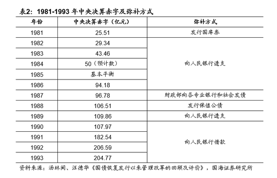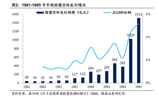 对债务态度有转变,国债成为积极财政的重要工具。1981-1987年,弥补财政赤字的手段除发行国债以外,主要是由财政向银行透支,1995年开始《中央银行法》规定财政透支不能向中央银行透支或者借款,国债成为弥补财政赤字主要方式,90年代发行规模快速扩大。1993年发行额不到400亿元,1994年首次突破1000亿元,1995年超1500亿元,1996年达1847.7亿元。但根据1994年出台的《预算法》规定,发债收入和债务利息支出不计入财政赤字。1998年受亚洲金融危机冲击,首次向商业银行增发国债1000亿元,发行2700亿特别国债来补充四大国有银行资本金。1999年再次调整预算,向银行增发600亿元长期国债,用于增加固定资产投资;2000年财政部再次增发500亿元长期建设国债,三年来,通过调整预算增发国债2100亿元;2007年发行1.55万亿元国债用于购买约2000亿美元的外汇,用于组建中投公司。