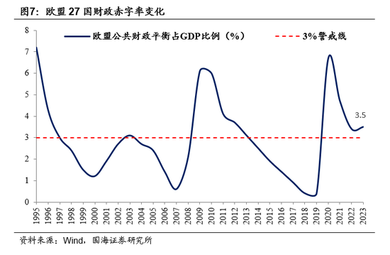 欧盟常规性突破3%来应对危机。面对经济下行压力,欧盟1995、1996年财政赤字率分别达7.2%、4.3%,1997年经济有起色后才回到3%。美国次贷危机爆发后,欧盟迅速突破3%的限制,2009-2013年平均赤字率为4.6%,助力经济回升。近年来,疫情冲击下,欧盟再次施行扩张性财政政策,2020-2023年平均赤字率达4.5%。欧盟是3%红线的发源地,但果断突破红线以应对经济危机。