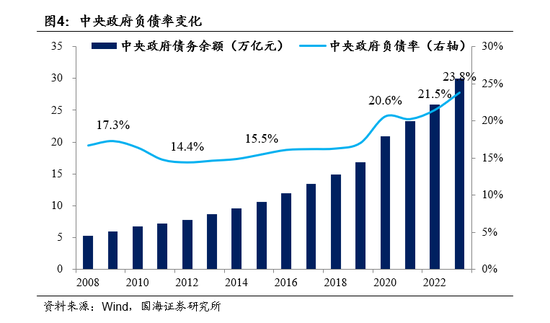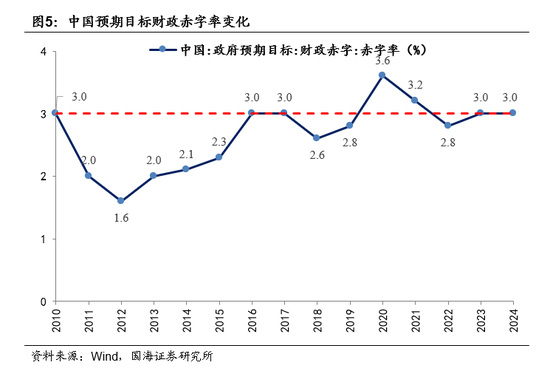 赤字态度转向积极。2016年我国财政赤字率提高到3%,首次触碰“3%国际警戒线”水平。2024年10月12日,财政部长蓝佛安在新闻发布会上明确表示,“中央财政还有较大的举债空间和赤字提升空间”。
