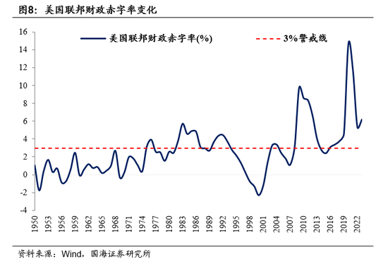 美国联邦政府财政赤字率常年在3%以上。1984-2023年这40年联邦政府财政赤字率年均值为3.8%,有24个年份超过3%。刨除疫情影响,1980-2019这40年均值也高达3.2%、有22个年份超3%。尤其是面对经济下行,财政政策更加激进,2007年次贷危机爆发后,2008、2009年赤字率分别较上年增加2.0、6.7个百分点;应对2020年疫情冲击,赤字率较2019年大幅增加10.1个百分点。