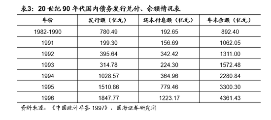 对债务态度有转变,国债成为积极财政的重要工具。90年代国债发行规模快速增加。1993年发行额不到400亿,1994年首次突破1000亿,1995年超1500亿,1996年达1848亿。1998年首次增发国债1000亿,发行2700亿特别国债来补充四大国有银行资本金,1999年增发600亿长期国债,2000年再次增发500亿长期建设国债。