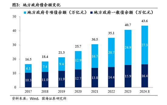 为地方“开正门”,2014年正式允许地方财政赤字。2014年《预算法》修订,开始建立全口径的财政预算管理制度,并允许地方通过发行地方政府债券举债。2015年“地方财政赤字”表述首次出现在政府工作报告和当年财政预算报告中。根据Wind统计,截至2024年10月28日,地方债余额达44.96万亿元,其中一般债16.39万亿元、专项债28.57万亿元。