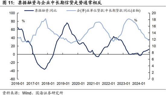 企业票据融资活动与企业中长期信贷投放走势相反。在常规信贷投放不畅时,银行使用票据冲量现象较为普遍,因此票据融资可视为常规信贷投放的反向指标。