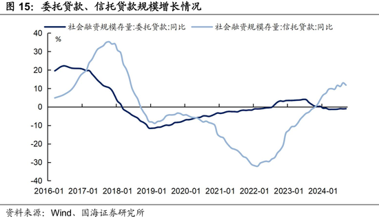 2018年以来“去通道化”监管使得委托贷款、信托贷款规模长期处于下行周期。但2022年以来,随着信托结构优化、资产管理信托业务的快速增长,信托贷款增速回升至0以上。