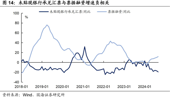 未贴现银行承兑汇票规模增速与票据融资增速呈负相关性。展望2025年,我们认为企业信贷将逐步修复,银行进行“票据冲量”的现象将有所缓解,推动未贴现银行承兑汇票规模回升。我们预计2025年底未贴现银行承兑汇票规模增速将回升至-10%左右。
