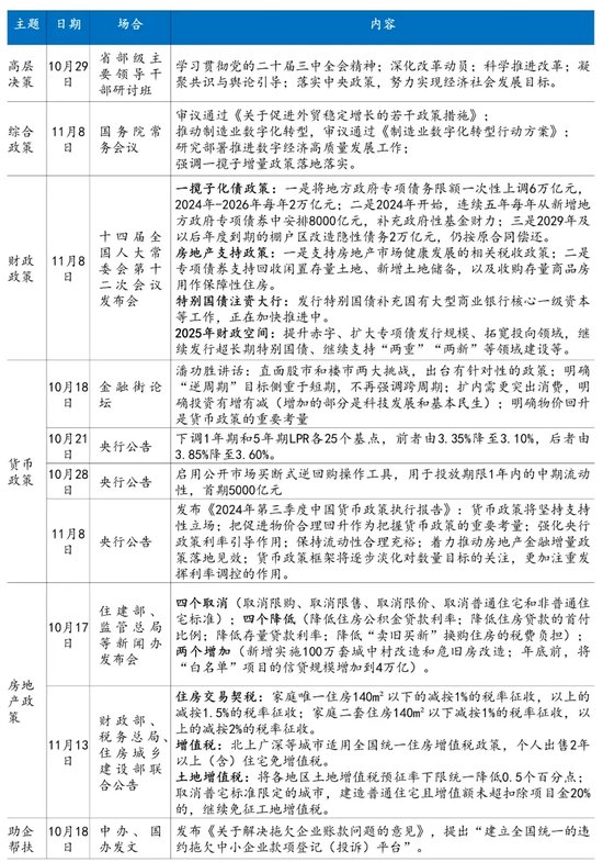 以9•24新闻发布会启动,至11月8日人大常委会闭幕并由明确化债部署,一揽子增量政策已经基本配齐。与以往相比,本轮增量政策具有两个方面的典型特征: