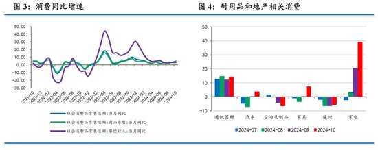10月社会消费品零售同比增长4.8%,较上月加快1.6个百分点。“两新”政策效应继续展现,带动耐用消费品增速反弹,就业和财产性收入改善也对消费产生积极效果。