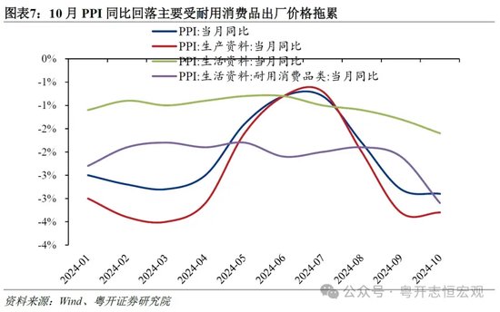 第三,CPI和PPI同比回落主要受食品和能源价格波动、企业降价促销等影响,未来有望温和回升。10月CPI同比小幅回落0.1个百分点,一是极端天气对鲜菜等食品的供给冲击消退,食品价格同比由3.3%回落至2.9%;二是能源价格下降,交通工具用燃料价格同比由-7.6%降至-10.5%。10月核心CPI同比由0.1%回升至0.2%,反映了居民消费出现回暖势头。10月PPI同比回落0.1个百分点,一是受国际原油价格波动下行对我国的输入性影响,石油和天然气开采业,石油、煤炭及其他燃料加工业价格同比降幅均较上月扩大4.5个百分点;二是国内部分行业竞争加大,企业降价促销,例如耐用消费品出厂价格同比由-2.1%降至-3.1%。10月钢铁、水泥价格出现止跌回升,黑色金属冶炼和压延加工业、非金属矿物制品业价格分别为连续4个月和3个月环比下降后首次上涨。随着一揽子增量政策加快推出,居民需求提振释放,CPI同比有望温和回升,PPI同比降幅也将逐步收窄。