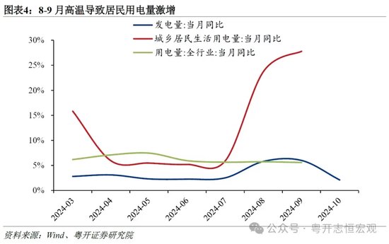 第一,工业生产持续恢复,同比回落主因居民用电的暂时性扰动。工业包括采矿业、制造业和公用事业(电力、热力、燃气及水生产和供应业)。10月采矿业和制造业增加值同比上升,与制造业PMI重回景气区间相一致;但电力、热力生产和供应业增加值同比由10.2%降至5.5%,导致工业增加值同比由5.4%回落至5.3%。8-9月高温天气使得居民用电量激增,10月天气转凉带动居民用电量回落,10月发电量同比由6%降至2.1%。
