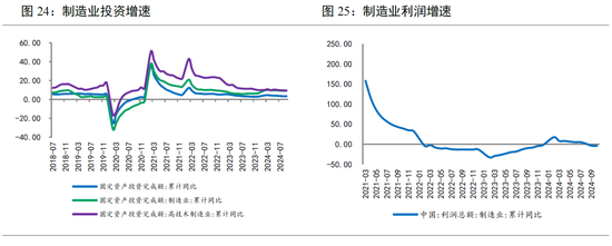 2024年制造业投资增速之所以保持较高水平,一是由于出口带动。2024年出口继续保持较强韧性,出口-制造业链条运转良好,特别是船舶制造业、通用设备、专用设备制造业投资等均保持在两位数以上增速;二是政策支持。1-10月设备工器具购置维持在16.1%的较高水平,中央推出的大规模设备更新政策对于制造业投资有较强提振;三是由于上年基数相对较低。