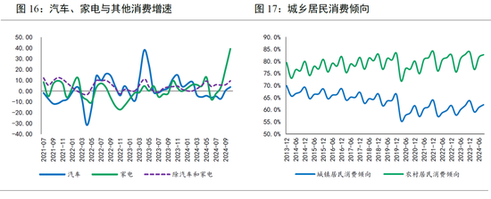 二是乡村消费增速持续高于城镇。2022年初以来,随着房地产市场和资本市场转向下行,城镇居民财产性收入受到拖累,消费增速降至乡村消费之下。进入2024年以后,两者差距进一步拉大。目前乡村地区的消费倾向已经恢复到疫情之前水平,而城镇地区则仍相差较远。