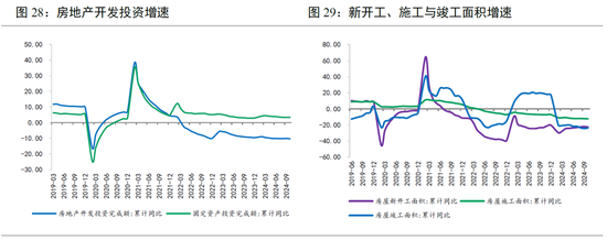 但从投资端看,由于9•26政治局会议提出“对商品房建设要严控增量、优化存量、提高质量”。加上目前待售面积仍处于较高水平,消化存量压力较大,自然资源部对于去化周期长的地区限制住宅用地供应,各种因素叠加,导致房企继续拿地和新开工意愿不足,房地产开发投资增速始终难以回稳。