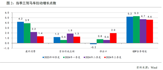 三季度GDP同比增长4.6%,延续回落势头,但略好于市场预期。其中,最终消费拉动点数为1.4,资本形成总额拉动点数为1.3,但净出口拉动点数上升至2.0,分别较上一季度-0.8、-0.6和+1.4个百分点,表现出外需强于内需特征。随着前期“两新”政策效应显现,9月耐用品消费、工业生产和制造业投资等都有好转,9月下旬一揽子增量政策出台对市场信心形成提振,共同带动三季度GDP好于预期。