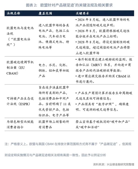 一是政策和市场对碳足迹的披露要求正迅速从自愿走向强制、从区域化走向全球化。以欧盟为主的主要经济体正建立以碳足迹为核心的气候治理体系,并在贸易规则中加入以碳足迹披露为核心的准入条款。2023-24年间,欧盟多项针对产品碳足迹的法规正式通过或已进入实施落地阶段(图表1),对全球的贸易流量和产业链上游布局将产生直接影响。
