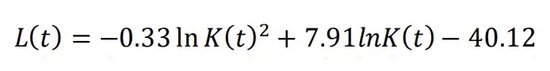 ,那么该国经济将持续下降,人口增速也持续减少。根据中国劳动力数量和资本存量的对数之间关系,我们拟合测算得到两者之间的函数关系为: