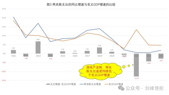 再来看两本账支出、即一般公共预算支出与政府性基金支出的情况(图3)。显然,两本账的支出增速更是慢于一般公共预算支出的增速。自2021年三道红线政策出台后,两本账的支出增速都显著低于名义GDP增速。根据今年房地产市场的状况,恐怕依然是如此。