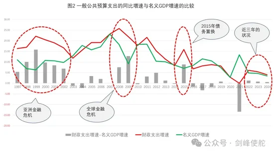 先看一般公共预算的支出状况(图2)。所谓逆周期调节的财政政策,顾名思义,就是当经济下行时增加财政支出,反之亦然。观察1997年以来的一般公共预算支出增速,并与名义GDP增速做一对比。可以发现,在1998年亚洲金融期间、2008年全球金融危机后以及2015年地方政府债务置换时期,一般公共预算支出的增速都快于名义GDP增速,所以,这三个时期的财政政策是逆周期的。