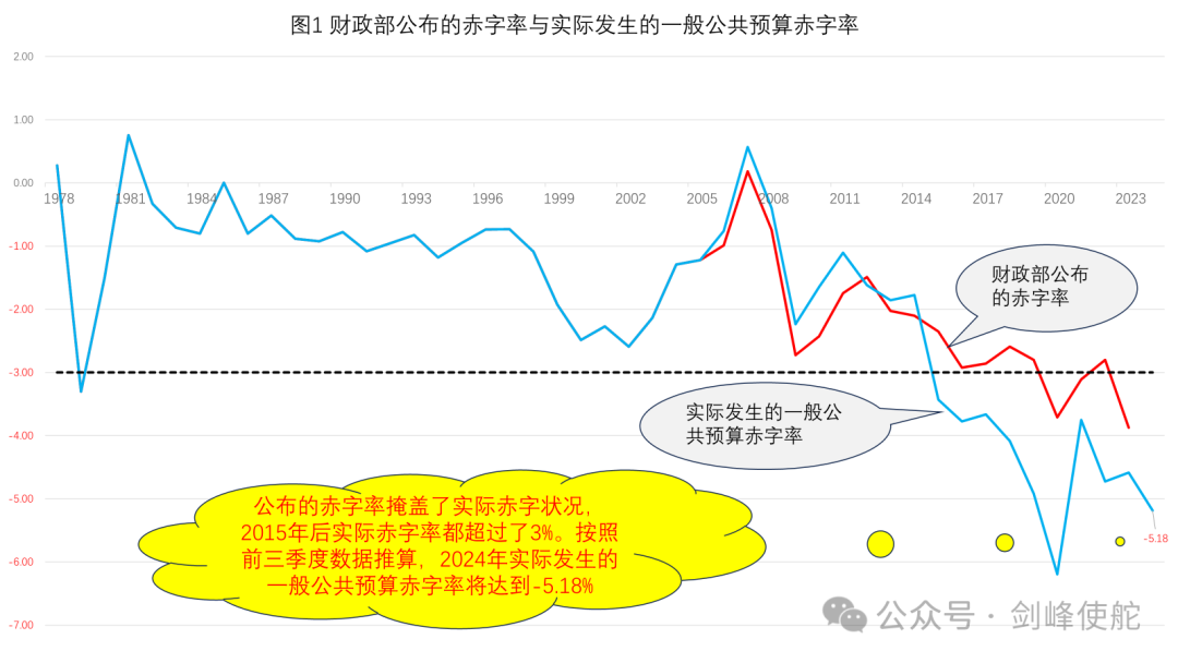实际发生的赤字则非常简单,就是一般公共预算支出与一般公共预算收入之差: