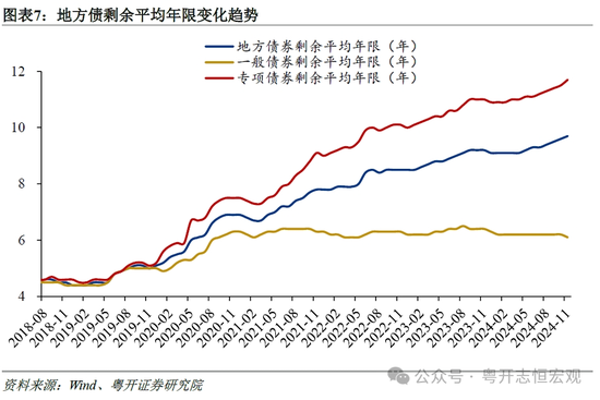 六是专项债券平均发行年限超15年,剩余平均年限逐渐拉长。自2019年以来,随着专项债券使用范围不断扩容,特别是允许专项债作为重大项目资本金,30年超长期的专项债发行量大幅增加,专项债的发行年限逐渐拉长。2024年1-11月,专项债券的平均发行年限为15.6年,比一般债券的8.4年高出7.2年。随着超长期专项债券发行占比提升,专项债剩余平均年限增长较快。截至2024年11月底,专项债券剩余平均年限达到11.7年,较2019年初拉长7.2年。