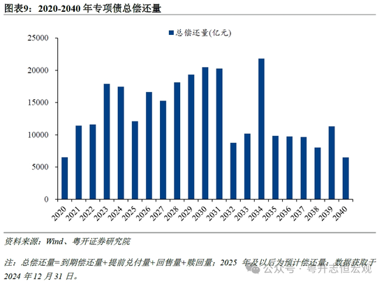 三是2025年专项债到期规模低于2024年,预计再融资专项债券的发行规模在3万亿元左右。地方政府债券到期后,除发行再融资债券偿还外,部分直接安排财政资金等偿还。到期续发比例=(再融资债券-特殊再融资债券)/到期规模。历年地方政府债券到期续发比例较高,维持在85%左右。2018-2023年地方政府债券到期续发比例分别为81.3%、87.3%、87.2%、86.3%、86.1%和89.8%。截至2024年12月31日,Wind数据显示2025年专项债到期规模为1.2万亿元,在2023-2031年中处于最低水平。按照到期续发比例85%计算,2025年需要发行1.0万亿元再融资专项债券用于偿还到期债券本金。加上用于置换隐性债务的特殊再融资专项债券2.0万亿元,预计2025年再融资专项债券的发行规模在3.0万亿元左右。
