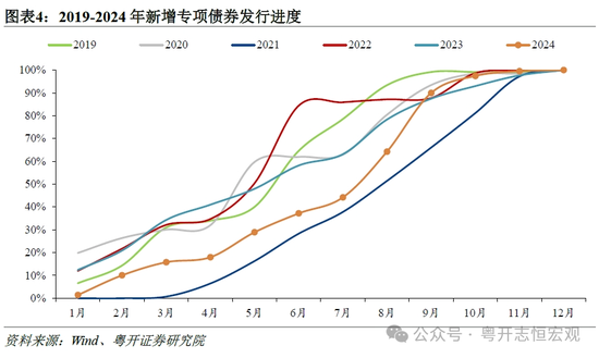 四是新增专项债券发行节奏前慢后快,总发行规模略超全年额度,但仍在限额内。上半年,新增专项债券发行进度偏慢;下半年以来,新增专项债券加快发行,2024年全国发行新增专项债券4.0万亿元,略超全年新增额度3.9万亿元,剩余部分使用的是结存限额。