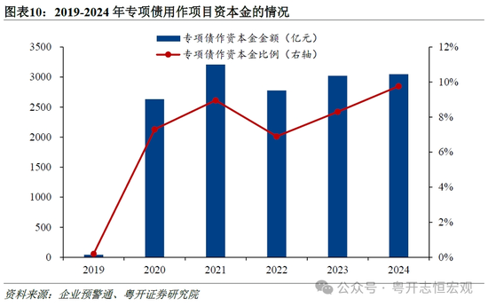 六是进一步提高专项债用作项目资本金的比例。《关于优化完善地方政府专项债券管理机制的意见》明确,提高专项债券用作项目资本金的比例,以省份为单位,可用作项目资本金的专项债券规模上限由该省份用于项目建设专项债券规模的25%提高至30%。从实践来看,2020年以来新增专项债用作资本金的规模呈上升趋势,2020-2024年专项债用作项目资本金的规模分别为2631.1、3207.9、2777.0、3022.1和3047.8亿元,占当年用于项目建设的专项债的比例分别为7.3%、9.0%、6.9%、8.3%和9.8%,距离30%的上限有待进一步提高。