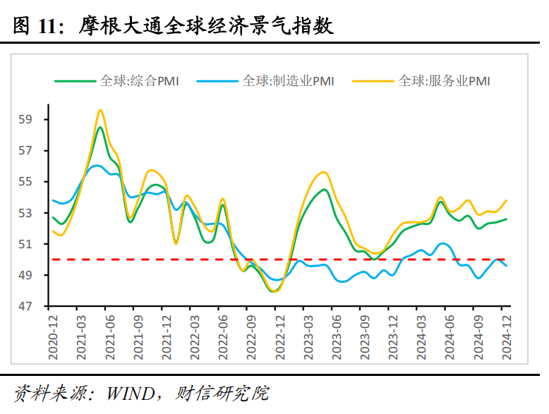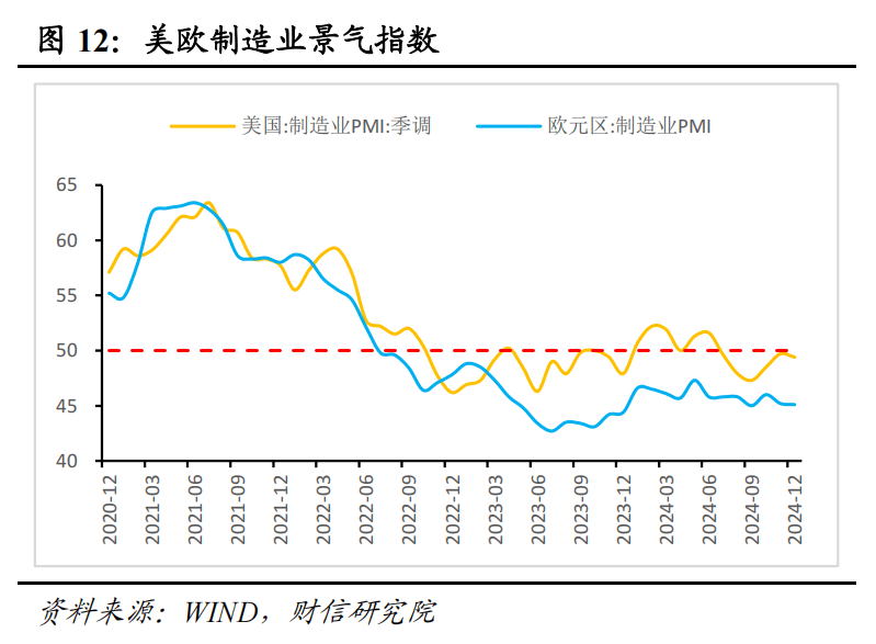 一是全球央行降息降低资金成本与全球制造业需求回升,均对全球商品贸易量形成支撑。一方面,随着2024年9月美联储27个月以来首次降息,全球已经进入新一轮降息周期,降息将降低各国资金成本,带动消费和投资,从而促进全球需求回暖。另一方面,我国出口贸易以工业制成品为主,因此全球制造业PMI可作为外需的替代指标。12月摩根大通全球综合PMI、制造业PMI、服务业PMI分别录得52.6%、49.6%、53.8%,分别较11月变化0.2、-0.4、0.7个百分点(见图11),制造业PMI重回荣枯线下方,服务业是全球需求恢复的主要贡献力量。预计在新一轮科技革命兴起、发达国家加快再工业化进程的影响下,2025年全球制造业需求有望温和回升,对全球贸易数量形成一定支撑。分国家看,12月美国、欧元区制造业PMI指数分别录得49.4%、45.1%,较上月分别回落0.3和0.1个百分点(见图12),预计美国受国内经济较为强势影响,制造业PMI有望重回荣枯线上方,商品贸易量将迎来改善;但欧盟等地区经济下行压力较大,或将对外需形成一定拖累。