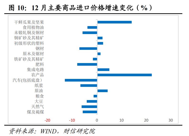 12月份进口数量增速环比回升的品种由11月份的3种增加至12种,反映出国内需求温和恢复。预计2025年年初进口增速面临一定的高基数效应压制,但受益于一揽子政策进一步落地见效、各地奋战“开工红”,进口增速低位企稳仍具有一定支撑。