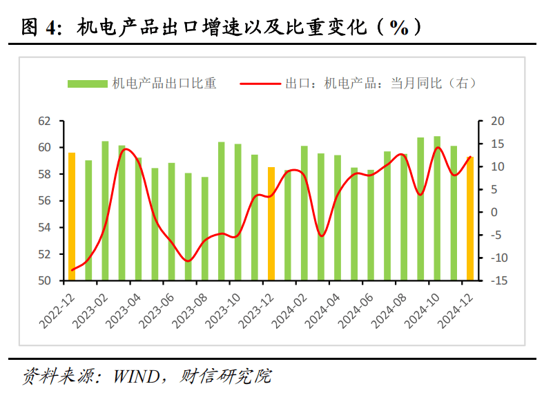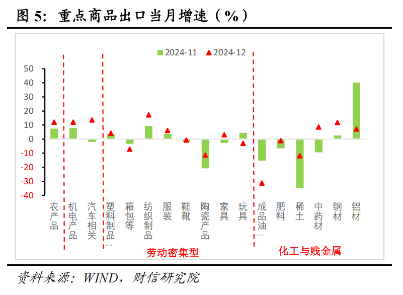 二是分产品看,机电产品和劳动密集型产品出口增速均回升,前者对出口的支撑作用更强。12月份机电产品出口同比增长12.1%,较11月份回升4.0个百分点,对出口增速的拉动作用较11月份上升2.4%,贡献了出口增速回升幅度的六成(见图4)。其中,汽车相关商品出口增速较11月份大幅回升15.7个百分点,是本月出口增速回升的重要支撑。分重点商品看,12月份重点商品中包括纺织制品、服装、陶瓷产品、家具等在类的劳动密集型产品,以及肥料、稀土、中药材、钢材等化工与贱金属出口增速均有所回升,对出口形成支撑。