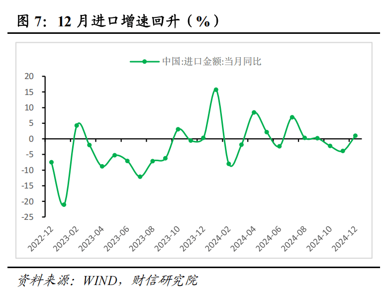 二、数量因素支撑进口增速由负转正,国内需求出现回暖迹象。去年同期进口增速增长,表明基数不能解释本月进口增速的回升,另有其他原因:从进口量和价看,数量因素是进口增速由负转正的主要支撑;在18种重点商品中,12月份进口数量增速环比回升的品种由11月份的3种增加至12种,反映出国内需求温和恢复。预计2025年年初进口增速面临一定的高基数效应压制,但受益于一揽子政策进一步落地见效、各地奋战“开工红”,进口增速低位企稳仍具有一定支撑。