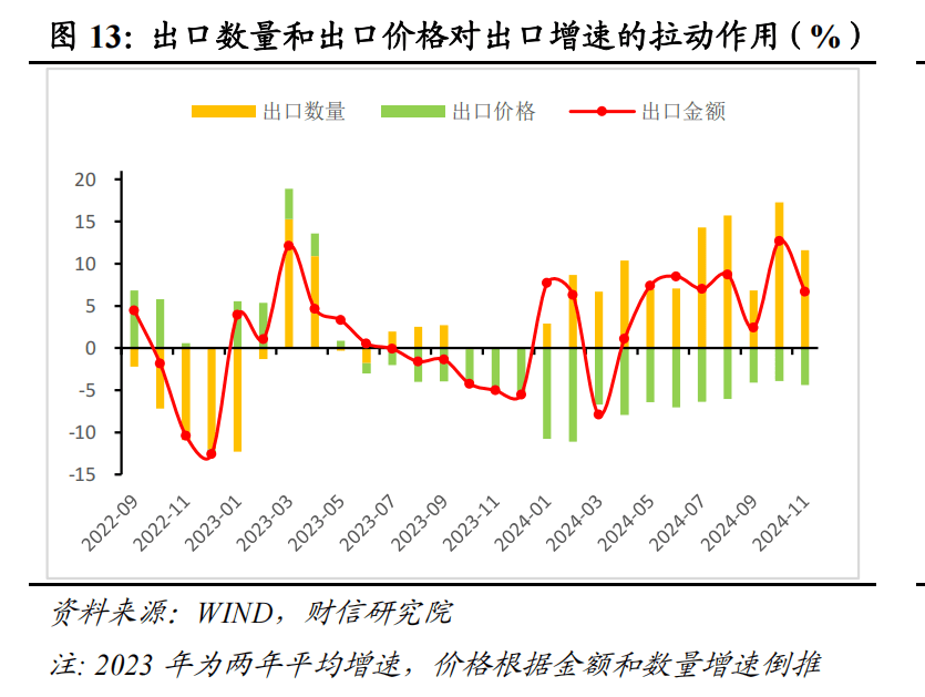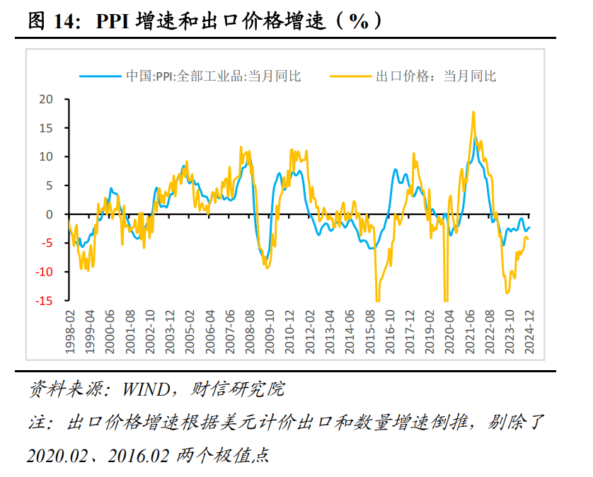 二是价格因素短期或对出口增速的拖累作用有望缓解,但趋势难改。历史经验显示,PPI同比增速领先出口价格增速0-6个月左右,预计国内一揽子刺激政策将继续促进国内工业品价格温和回升,加上全球需求对国际大宗商品的下拉作用减弱,2025年PPI降幅将继续收窄。由于房地产投资恢复仍需时日、全球经济中长期增长动能走弱,未来一段时间内PPI大概率继续负增长,价格仍将对出口增速形成拖累,但程度有望缓解。(见图13-14)。
