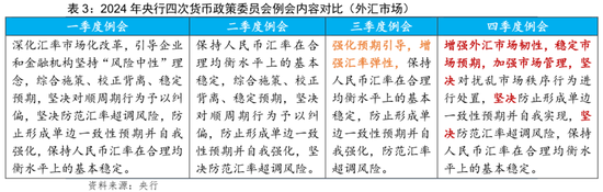 四季度例会在汇率方面的表述,相对三季度例会的“强化预期引导,增强汇率弹性”变化较大,更注重外汇市场的韧性和管理,重提2024年前两个季度的三个“坚决”,且将纠偏“顺周期行为”改为处置“扰乱市场秩序行为”,对外汇市场的重视程度有所加强。2025年,央行于1月9日在香港发行600亿元的6个月期的票据,于1月13日将企业和金融机构的跨境融资宏观审慎调节参数从1.5上调至1.75,已是对上述指导思想的践行。