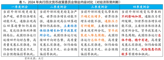 四季度例会于2024年12月27日召开,在2025年1月3日公布会议内容,相较三季度,在对国内外经济形势判断、下阶段货币政策安排、外汇市场、房地产市场等方面有所变化,对债市利率的潜在影响值得关注。