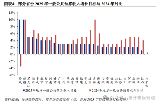 3、与2025年GDP目标相比:总体上看,地方财政收入增长目标大幅低于GDP目标。30个省份2025年地方财政收入目标增长2.9%,低于GDP增速目标2.4个百分点。分省份看,多数省份财政收入增长目标低于经济增长目标1至3个百分点,仅有新疆、黑龙江等少数省份财政收入持平或高于GDP增速目标。经济大省2025年财政收入增长目标均低于GDP增长目标。广东、山东、江苏、上海、浙江、四川、安徽2025年财政收入目标分别低于GDP目标2.0个、2.0个、3.0个、3.0个、3.5个、3.5个、3.5个百分点。