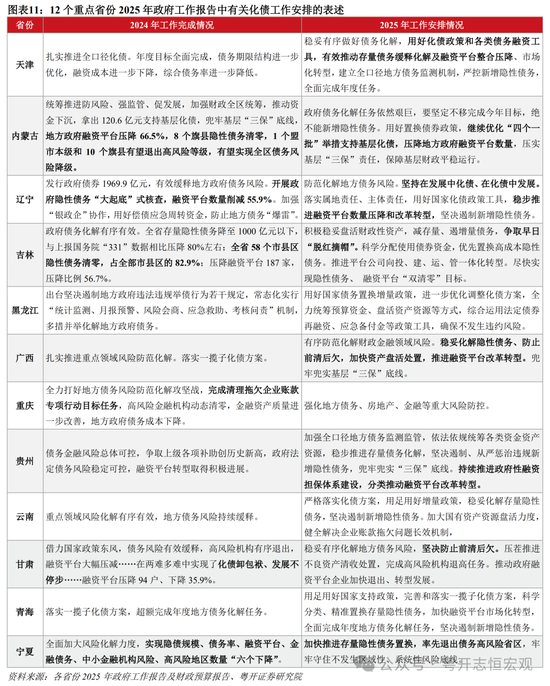 第四,严守财经纪律严控增量债务,部分地区有望退出化债重点省份名单。地方均强调财经纪律,遏制债务新增,防止“前清后欠”。2025年,宁夏加快推进存量隐性债务置换,有望成为“率先退出债务高风险省区”。还有一些重点省份提及推动全域债务风险下降或降级,天津“综合债务率进一步降低”,吉林争取早日“脱红摘帽”,内蒙古“有望实现全区债务风险降级、有望率先退出高风险省份”。