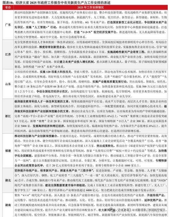 二是加快新兴产业集群发展,加速完善未来产业政策体系。广东、江苏、北京均提出要综合治理一些行业“内卷式”竞争,促进产业统筹布局、良性发展。各地加快新兴产业集聚,推动优势产业集群发展,促进优势产业和优势地区的增长。2025年,安徽要建设具有国际竞争力的先进制造业集群,加快建设世界级新能源汽车产业集群、世界级智能语音及人工智能产业集群、世界级先进光伏和新型储能产业集群。各地未来产业进入“政策导入期”,下一步将在产业链前端和后端着力。前端,要推动颠覆性创新,补齐科技成果转化薄弱环节。后端,要开拓技术和产品应用场景,以扩大需求带动产业发展。目前各地区已经开展了诸多先行探索,北京、广东、江苏、浙江等多个省市建立未来产业发展先导区。上海着眼产业高端化,加快推进人工智能产业创新高地建设,培育壮大低空经济、大飞机、新能源汽车等战略性新兴产业和未来产业。