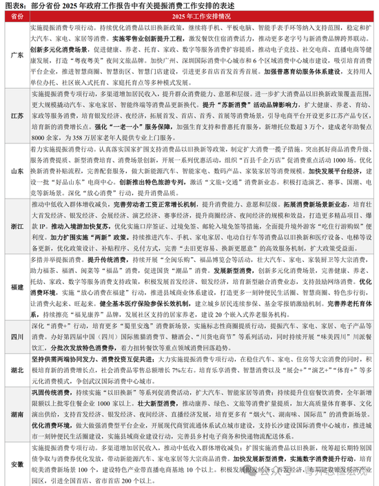 第三,提高养老、育幼、医疗设施和服务保障水平,解决居民消费后顾之忧。根据目前政策,3岁以下托育服务属于非基本公共服务范畴,属于地方事权。但地方往往对重视程度不高,托育服务供给不足;且托育服务运营成本较高,普惠程度较低。2025年,各地加大养老育幼等服务供给,减轻家庭生育、养育、教育负担。广东提出,完善生育休假制度,加强普惠育幼服务体系建设,支持用人单位办托、社区嵌入式托育、家庭托育点等多种模式发展。浙江提出,规范实施生育保险、休假、补贴等制度,开展普惠托育基本公共服务试点。福建提出,健全基本医疗保险参保长效机制,建立城乡居民连续参保、基金零报销激励机制。上海提出,新增3000张养老床位,改建3000张认知障碍照护床位,加强养老与医护床位联动衔接、资源共享。