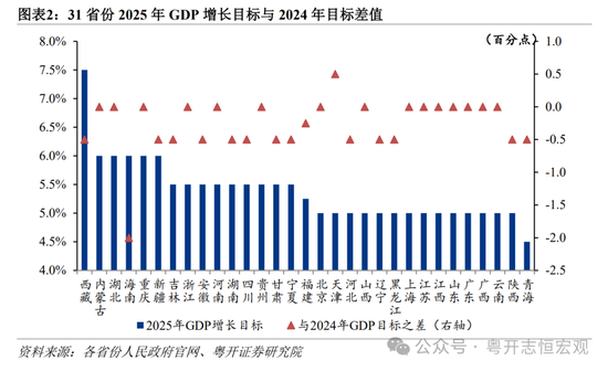 2、与2024年目标相比:地方GDP增长目标总体稳定,31省份2025年GDP增长目标加权平均值为5.3%,略低于2024年目标0.1个百分点,平均仍保持在5%以上的水平。当前各地既面临外需不确定、国内有效需求不足的问题,也有前期增量政策逐步显效的有利形势,地方制定的2025年经济增长目标小幅调整,但总体基调依然积极进取。