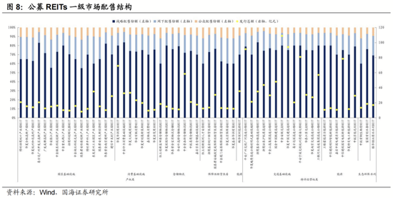 从项目属性及资产类型看,一级发行中产权类、特许经营权类战略配售平均占比分别达70%、76%,发行只数较多的板块中交通运输REITs、能源基础设施REITs及消费基础设施REITs战略配售平均占比较高,达76%左右。
