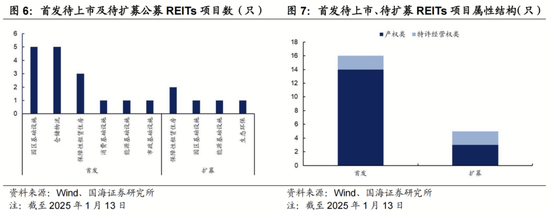 从2025年1月13日已公布首发待上市公募REITs来看,产权类首发及扩募占比分别达到88%及60%,园区、仓储物流及保障房待上市储备较多,2025年供给或维持增长。