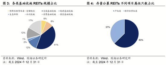 我国REITs根据项目属性分为产权类与特许经营权两大类,市值比例接近1:1,交通、能源、生态环保、水利等基础设施REITs多为经营权类,园区、消费、仓储物流、保障房基础设施REITs基本均为产权类REITs。