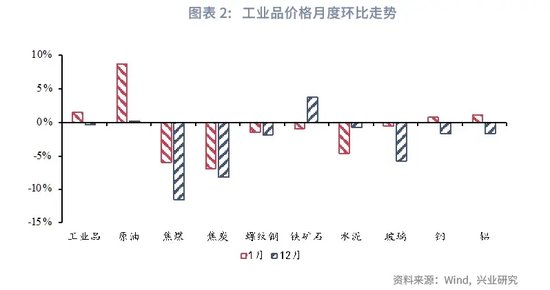 工业品方面,1月主要工业品价格跌多涨少。截至1月24日,黑色系商品价格继续回落,焦煤、焦炭、螺纹环比-5.9%、-6.8%、-1.4%;水泥和玻璃价格分别环比下跌4.8%和0.6%;有色金属价格回升,铜、铝环比分别录得0.5%、0.9%;受OPEC减产影响,1月原油价格环比增长9.0%,对PPI形成一定支撑。综合来看,1月PPI同比预计录得-2.3%。