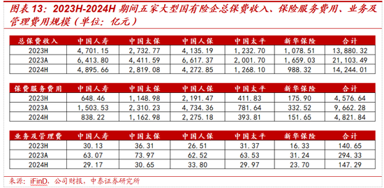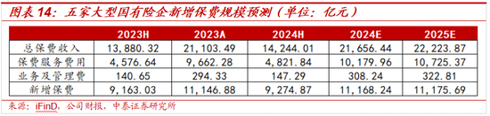 假设:(1)对“新增保费”定义的理解及假设:由于国新办会议未明确“新增保费”定义,市场对于其有不同理解。我们认为,从保险公司经营实务来看,“新增保费”可理解为其保费收入在扣除赔付及费用开支后的实际可投保险资金,因此在测算中,我们假设新增保费=险企总保费收入-(保险服务费用+业务及管理费用),且不考虑存量资产到期后带来的再投资资金因素。(2)测算样本:预计国有大型保险公司将成为增量资金的重要贡献来源,我们以五家上市国有大型保险公司作为测算主体。(3)数据层面:假设2024H总保费收入、保费服务费用与业务及管理费规模占2024A三者规模的比例与2023年相同;假设2025年总保费收入、保费服务费用与业务及管理费规模同比增速与2024H同比增速相同。
