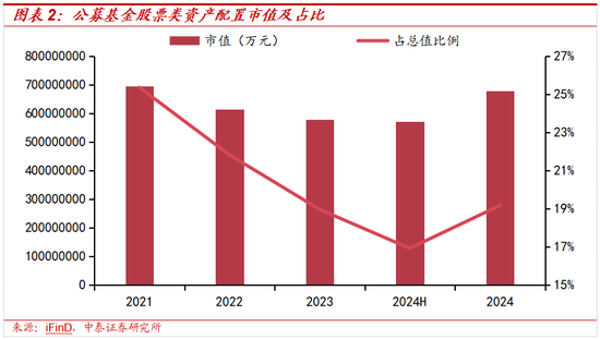 作为资本市场重要的机构投资者和买方力量,公募基金同样是中长期资金重要组成成分之一。据国新办发布会公布数据,公募基金行业总规模从2019年的13万亿元已增长至2024年的33万亿元,其中以股票投资为主的权益类基金规模从2.3万亿元增长到8.2万亿元,二者CAGR分别达到+82.06%/+42.62%,保持良好增长态势。然而,受近年来股市波动等影响,权益类基金出现一定亏损,股票类资产配置市值与占总值比例持续下滑,规模与占比均在2024H达到最低点,行业内部分公司投资理念出现偏差,存在注重短期收益而忽视长期发展的问题。对此,《实施方案》与国新办发布会中提出要提高权益类基金规模及占比并推进公募基金改革。