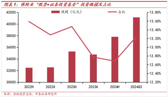 针对投资规模与比例,证监会主席吴清表示,对于商业保险资金,力争大型国有保险公司从2025年起每年新增保费的30%用于投资A股,这也意味着将每年至少为A股新增几千亿的长期资金;第二批保险资金的长期股票投资试点将在2025年上半年落实到位,规模不低于1000亿元,后续还将逐步扩大。截至2024Q3,人身险与财产险公司险资合计投资股票与证券投资基金规模41147.88亿元,占总投资规模比例为13.24%,虽然已为资本市场贡献稳定增量资金,但目前投资占比仍有较大提升空间。由此,金融监管总局副局长肖远企进一步提出“两个力争”,即力争每年新增保费30%用于投资股市、力争保险资金投资股市的比例在现有基础上继续稳步提高,从而发挥保险公司投资股票的潜力,特别是发挥大型国有保险公司的“头雁”作用。