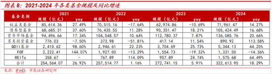 公募基金中权益类基金规模与投资A股占比将提升。2021-2024年期间,公募基金各类基金合计规模持续增长,2021/2022/2023/2024年同比增速分别达到+26.92%/+1.16%/+5.91%/+18.29%,截至2024年末合计规模达到322613.95亿元;其中,权益类基金(股票类基金+混合类基金)2022-2023年期间规模持续下滑拉低总规模增速,而2024年由于新“国九条”要求发展权益类公募基金、提升权益类基金占比与9月24日国新办新闻发布会明确“大力发展权益类基金”的影响,权益类基金规模与基金合计规模恢复增长,截至2024年末权益类基金规模/增速/占比分别为71961.47亿元/+14.27%/21.95%。未来在权益类基金规模保持增长,叠加国新办发布会强调公募基金持有A股流通市值未来三年每年至少增长10%的影响下,公募基金也将持续为股市带来资金流入。