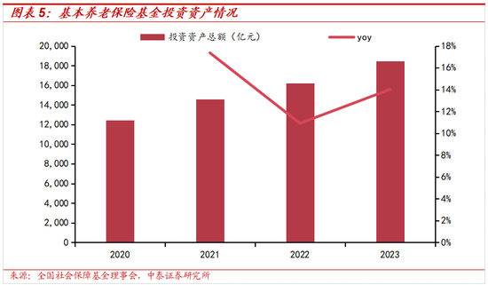 针对全国社保基金与基本养老保险基金,《实施方案》与国新办发布会同样提出提高股票资产投资比例并健全长周期考核机制。在提高投资比例方面,《实施方案》指出要“稳步提升全国社会保障基金股票类资产投资比例,推动有条件地区进一步扩大基本养老保险基金委托投资规模”;在健全考核机制方面,《实施方案》提出“细化明确全国社会保障基金五年以上、基本养老保险基金投资运营三年以上长周期业绩考核机制”。此外,国新办发布会中,财政部副部长廖岷强调,除了落实长周期考核体系外,下一步财政部也将结合市场发展形势,优化不同投资品种比例,完善全国社保基金投资管理制度,从而提高全国社保基金投资力度与灵活度。